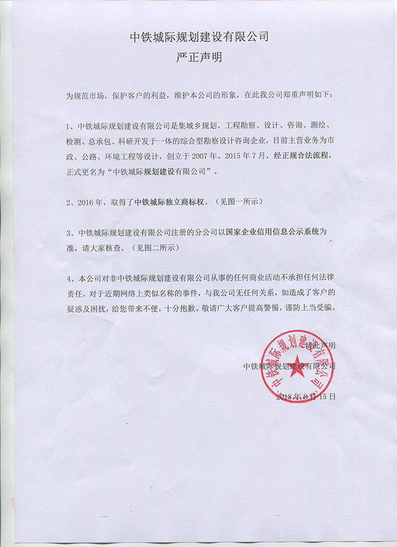 中鐵城際規(guī)劃建設有限公司 嚴正聲明