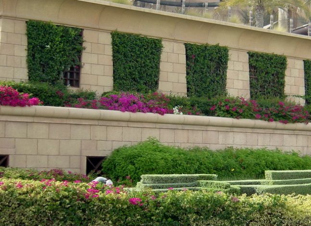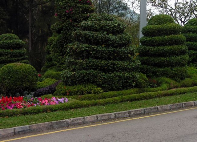分隔帶綠化的主要功能是按不同的行駛方向分隔車道,防止車燈眩光干擾,減輕對開車輛接近時司機心理上的危險感,或因行車而引起的精神疲勞,引導視線和改善環(huán)境。中央分隔帶的設計,在增強交通功能并能夠持久穩(wěn)定方面,要求考慮通過常綠灌木實現(xiàn),選擇時應重點考慮選用耐尾氣污染、生長健壯、慢生和耐修剪的灌木品種,一般可選用石楠、金葉女貞、紅花繼木、蜀檜柏、冬青等。在一些地段的分隔帶設計中,還可以組團式規(guī)則種植棕櫚、櫻花、西府海棠等特色小喬木來體現(xiàn)植物景觀的差異性。