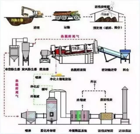 土壤修復技術中的熱脫附技術是指通過直接或間接加熱,將土壤中的有機污染物加熱到沸點以上,以使有機污染物從污染介質上得以揮發,進入氣體處理系統的過程。熱脫附技術優點:無復雜工藝;成本相對經濟;不造成二次污染。