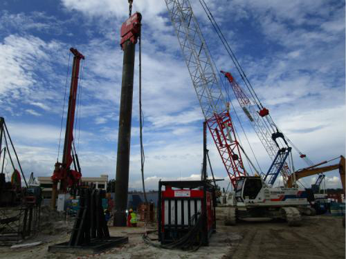 (4)選用的振動(dòng)錘功率要合適。鋼筋籠下放到距孔口1~2m時(shí),要靠帶護(hù)筒的振動(dòng)錘下送到設(shè)計(jì)標(biāo)高,一般樁徑400mm、樁長(zhǎng)不超過10m的樁,選用1.8kW的振動(dòng)錘即可滿足要求;600mm樁徑、樁長(zhǎng)小于15m的基樁,選用2.2kW的振動(dòng)錘為宜;