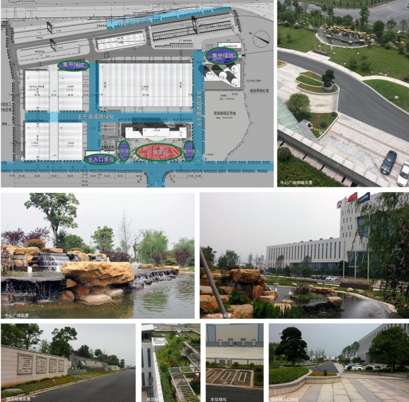 面:重點(diǎn)打造綜合樓入口中心廣場的景觀,高達(dá)一萬多平米的集中園林綠化為物流園區(qū)提供了清新的綠肺,作為園區(qū)核心風(fēng)貌景觀區(qū)與綜合樓相映成趣,提升了園區(qū)的整體景觀品質(zhì),也為園區(qū)物流人員提供了一個輕松交流、親近自然的休閑場所。除了中心廣場,我們還充分利用綜合樓的南北兩側(cè)裙房做了大面積的屋頂綠化,為五樓的辦公人員創(chuàng)建了舒心宜人的空中花園,兼具環(huán)保功能與景觀效益。在多層次的立體綠化園林襯托下,整個嘉寶物流基地顯得流光溢彩,生意盎然(圖17)。