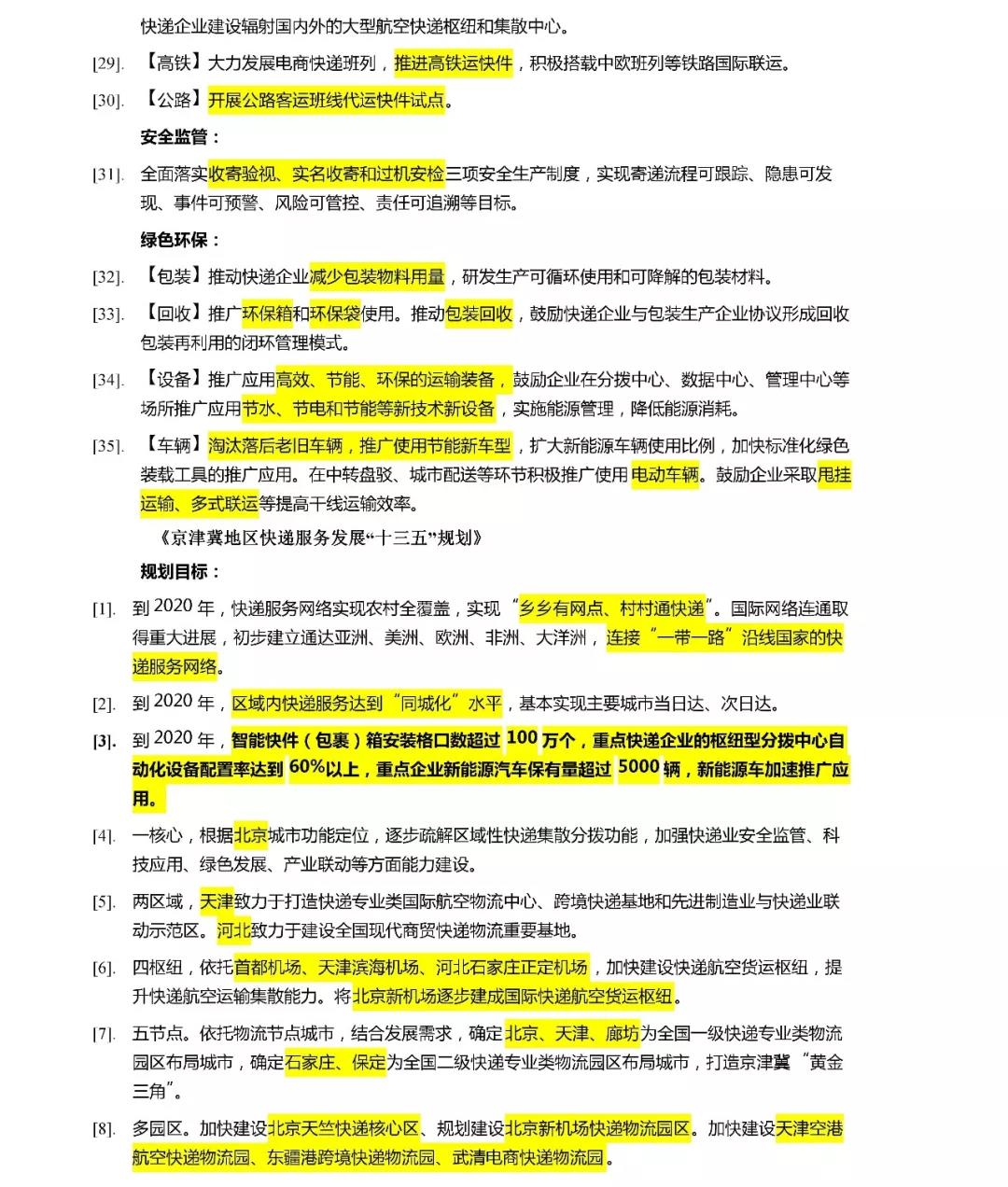 (3)到2020年,京津翼地區(qū),智能快件(包裹)箱安裝格口數(shù)超過100萬個,重點快遞企業(yè)的樞紐型分撥中心自動化設備配置率達到60%以上,重點企業(yè)新能源汽車保有量超過5000輛,新能源車加速推廣應用。