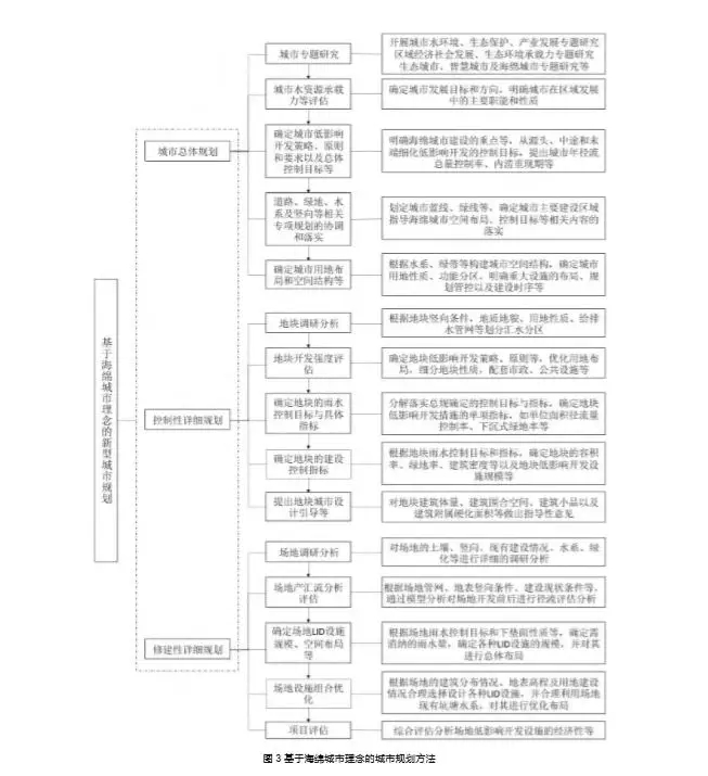 海綿城市建設是一個復雜的系統(tǒng),其建設應從城市 規(guī)劃的源頭著手,將海綿城市理念融入到城市各層級規(guī) 劃中,涉及到規(guī)劃、園林、水利、市政、道路等多部門、多專業(yè)之間的相互協(xié)調運作。海綿城市理念下的新型城市規(guī)劃方法對設計人員的要求已遠遠超過了傳統(tǒng)城市規(guī)劃專業(yè),主要體現(xiàn)在它需要多規(guī)合一,即強調不同專業(yè)和部門的協(xié)調運作;區(qū)域規(guī)劃,即強調城鄉(xiāng)統(tǒng)籌和流域綜合治理;新型城市化,即強調以人為本的工作思路;生態(tài)文明,即強調綠色理念、科學技術和路徑。與營造城市空間的傳統(tǒng)規(guī)劃不同,海綿城市規(guī)劃關注的是城市與生態(tài)環(huán)境尤其與水的關系,這就需要打破城市規(guī)劃、園林、道路、市政等專業(yè)的被動配合與有限交互局面,解決不同專業(yè)技術協(xié)調性的困頓。基于海綿城市理念的城市規(guī)劃方法見圖 3。