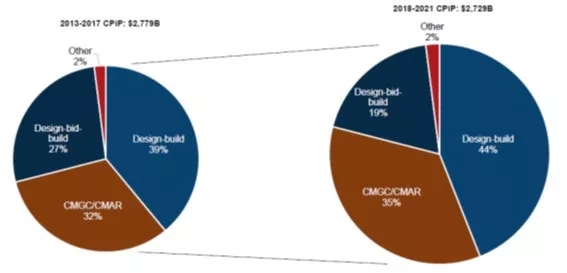 根據美國設計建造學會和FMI咨詢公司的研究,2013年到 2017年期間,美國工程建設市場上DB模式占比最高,達 39%;2018年到2021年的預測表明,DB模式占比將進一步擴大,達到44%。