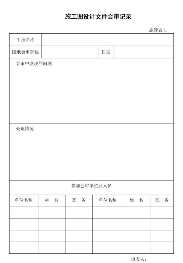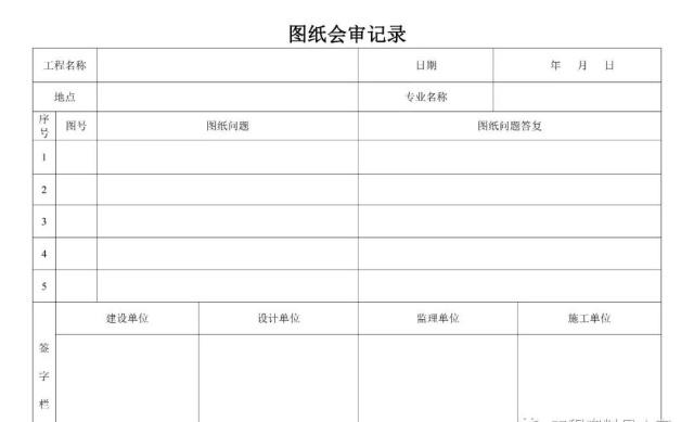 備 注:上表為城市(市政)道路工程國標(biāo)使用表格,各地表格存在差異,優(yōu)先選用各地方要求的相應(yīng)表格,其次考慮使用國標(biāo)表格,再次為了方便圖紙會(huì)審分類管理,也可參考使用下表。圖紙會(huì)審記錄需各單位項(xiàng)目負(fù)責(zé)人簽字,加蓋公章,作為施工圖紙的補(bǔ)充,后期為結(jié)算工程量提供依據(jù)。(以上僅供參考)