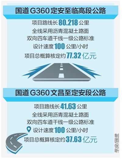 2019年8月,省發(fā)展改革委批復(fù)了國道G360定安至臨高段公路初步設(shè)計(jì)和概算。項(xiàng)目路線長80.218公里,全線采用瀝青混凝土路面,雙向四車道干線一級公路標(biāo)準(zhǔn),設(shè)計(jì)速度100公里/小時(shí)。項(xiàng)目總概算核定約77.32億元。