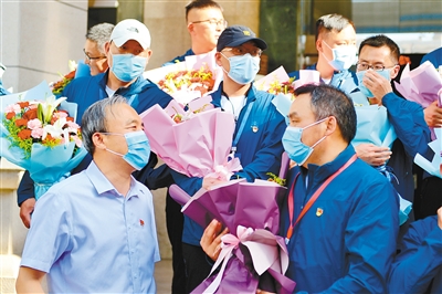 下午4點左右,29名珠峰高程測繪隊員們在大家翹首期盼下回到省測繪地理信息局。彼時,留守在“家”的戰(zhàn)友和家人們早已經(jīng)在這里等候他們。短暫的歡迎儀式后,家人和朋友們擁抱和握手成為他們表達思念的方式。這29名測繪隊員不少人已經(jīng)在珠峰待了兩三個月,有的甚至?xí)r間更長,回到西安讓他們感到格外親切。“我從過年前就去拉薩集訓(xùn)了,有大半年時間都沒有見到孩子了。太想念家人,想念西安的肉夾饃、泡饃啦!”皮膚黝黑的測繪隊員邢雄旺說。