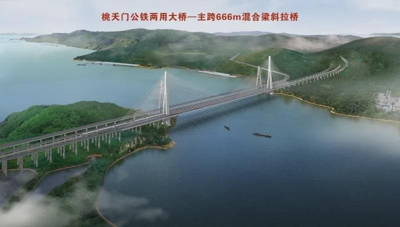 ,均為公鐵兩用,在同一平面布置了雙線鐵路及雙向六車道高速公路。其中,西堠門大橋采用斜拉懸索協(xié)作體系,主跨達(dá)1488米,建成后將是世界同類工程中跨度最大的公鐵合建橋梁;桃夭門大橋為分離式混合梁斜拉橋,主跨達(dá)666米。