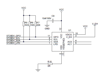 射頻閱讀器和識別器的核心在于RFID芯片。通常RFID芯片供電電壓1.8V-5.5V,帶有4K、16K或64K的E2PROM,通過片內(nèi)串行總線I2C或者射頻進(jìn)行數(shù)據(jù)傳輸。圖2為RFID芯片ST25的識別器電路原理圖。射頻識別芯片通過SCL和SDA和主控制器芯片完成通訊。控制器再和上位機(jī)完成信息交換傳輸。