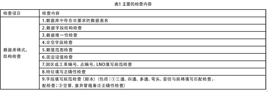 目前,全國(guó)各管線單位要求生產(chǎn)單位提交的數(shù)據(jù)集一般是Microsoft Office Access數(shù)據(jù)庫(kù)的mdb文件.數(shù)據(jù)庫(kù)格式、結(jié)構(gòu)檢查主要檢查管線數(shù)據(jù)庫(kù)中的數(shù)據(jù)表是否齊全是否存在多余的表、表的字段名和數(shù)據(jù)類型是否正確、字段值的填寫格式是否符合規(guī)程的要求等.主要的檢查內(nèi)容見(jiàn)表1:
