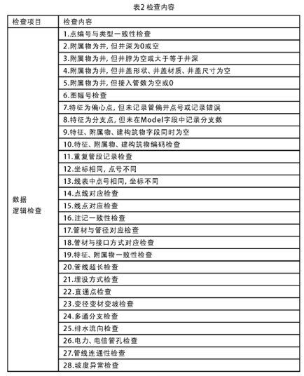 數(shù)據(jù)邏輯性檢查復(fù)雜多樣,主要包括: 屬性值的邏輯一致性檢查, 管線、管點(diǎn)要素邏輯結(jié)構(gòu)的合理性、正確性等.例如,在管線點(diǎn)數(shù)據(jù)表和管線段數(shù)據(jù)表中管線點(diǎn)編號(hào)相同的點(diǎn),其坐標(biāo)必須相同;如果附屬物為井,井深可定不能為0或空;個(gè)別管線段出現(xiàn)倒流的現(xiàn)象.主要的檢查內(nèi)容見(jiàn)表2: