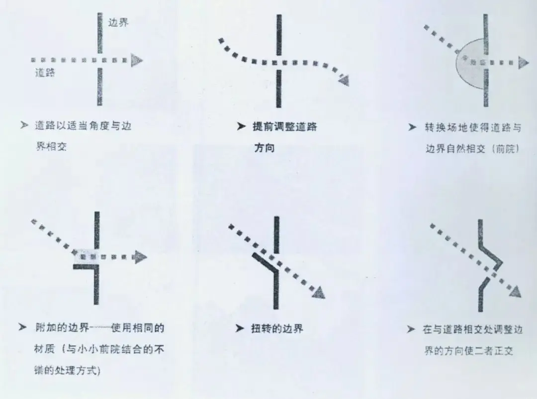 道路與邊界應讀以適當?shù)慕嵌认嘟弧H绻缆沸枰D(zhuǎn)一定方向與邊界相交,可以提前做適當?shù)奶幚怼0ㄌ崆罢{(diào)整道路的角度,在邊界前留出一塊轉(zhuǎn)換空地或者使得邊界與道路的方向相呼應。