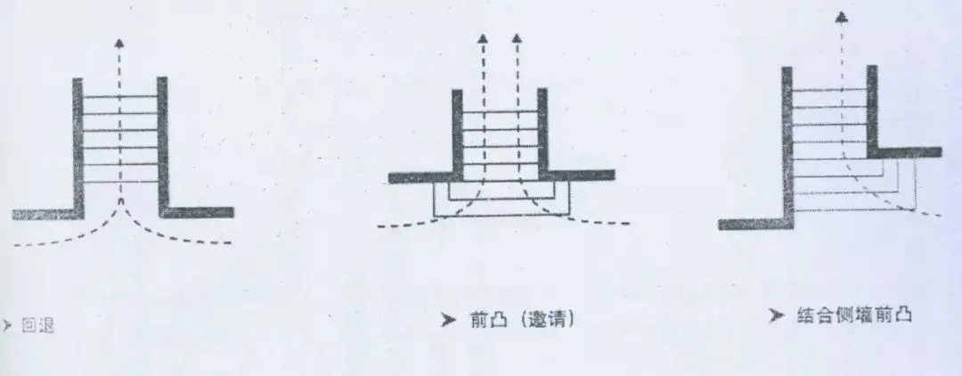 臺階以為著強烈的指向。在臺階上下的區(qū)域應當做特殊處理以表明方向的改變。因此,建筑邊沿的臺階應當向前延伸(公共性、邀請感)或者向后退縮(私密性、限制感),其他景觀看見宜同。