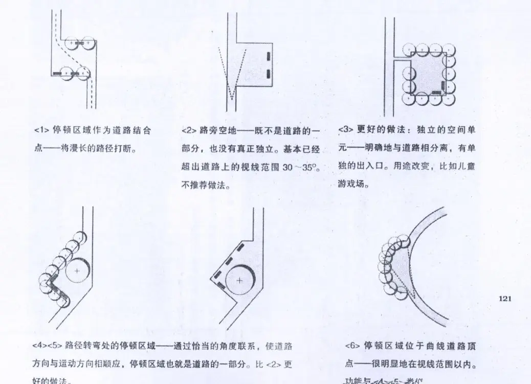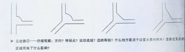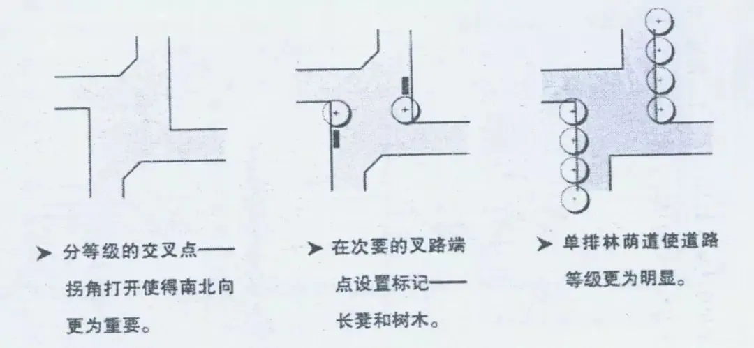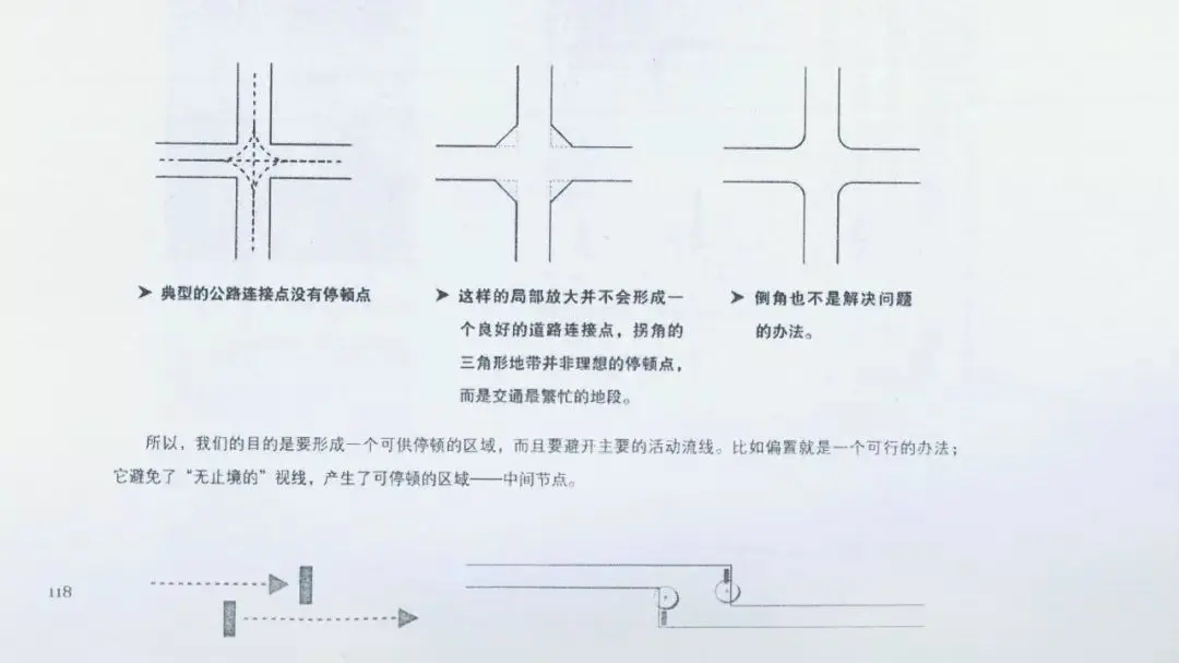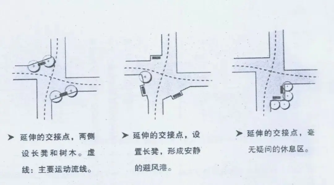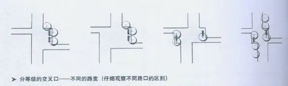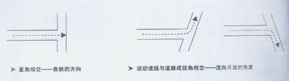 道路連接點與公路連接點不同,需要一些停頓區(qū)域。使用者在此稍作停頓,觀察選擇自己的運動方向。因此,連接點需要在交叉路口加寬,有足夠的空間。但是僅僅加寬道路并不會自動產(chǎn)生一個宜人的道路連接點。