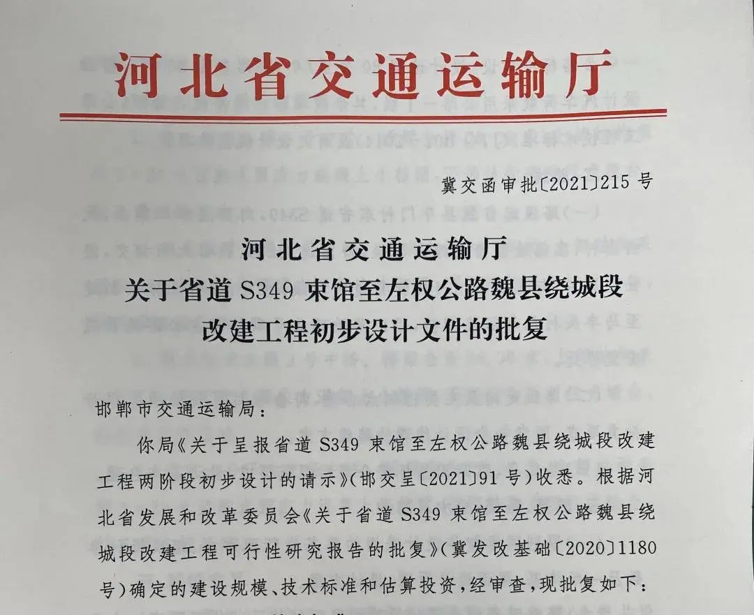 邯鄲S349束左公路魏縣段(新南環(huán))初步設(shè)計(jì)獲省批