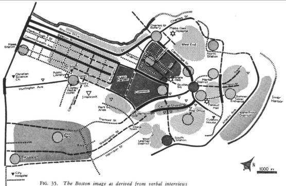 他們的方法使自下而上的公民體驗和需求的成為新的規劃聚焦點。上面這張1961年地圖是由麻省理工學院凱文·林奇的一個項目,該項目要求人們根據記憶來繪制波士頓的地圖,揭示了這座城市最“難忘”的部分。像如今FourSquare登入、Twitter流量、共享單車或使用者的地圖都是基于凱文·林奇的研究。