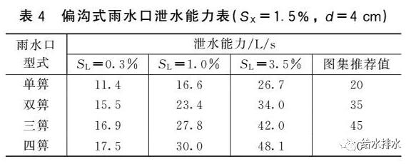 (1)雨水口泄水能力不應超過其偏溝流量,而我國標準圖集泄水能力推薦值卻超過了偏溝流量。對于箅前水深、道路橫坡和縱坡一定的偏溝式雨水口,其偏溝流量是固定的(見表6)。對于箅前水深4 cm的偏溝式雨水口,偏溝式雨水口泄水能力不應大于18.2 L/s(SL=0.3%)、33.1 L/s(SL=1.0%)、62.0 L/s(SL=3.5%),這和箅子數量無關。