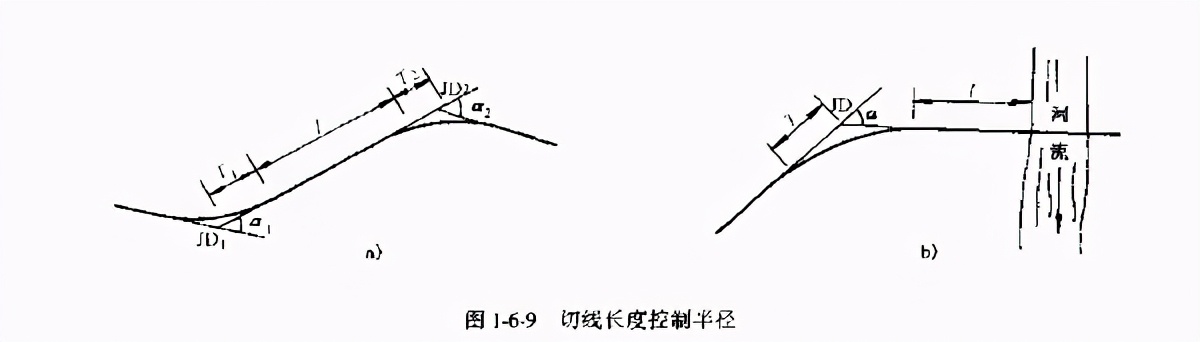 當已知交點偏角.其他條件不受限制時,如果平曲線半徑選得過小,則曲線長度太短顯然對行車不利。此時應用平曲線的最短允許長度來控制半徑,其計算公式為