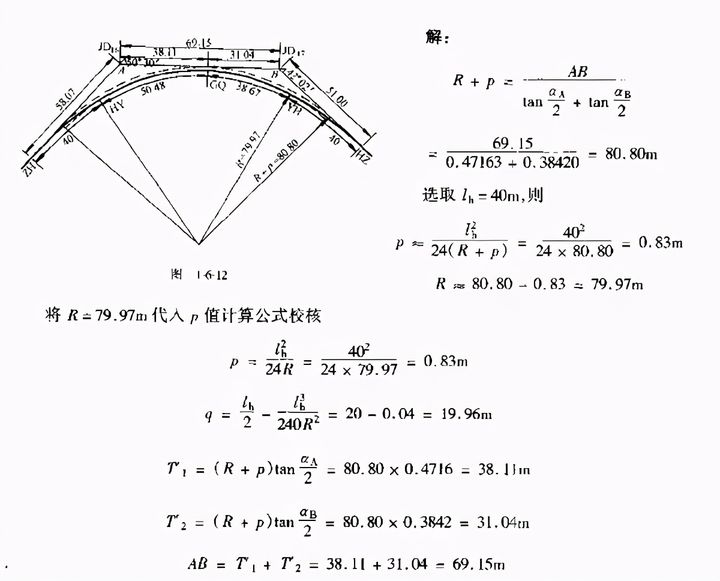 例1-6-2 如圖1-6-2,JD16為雙交點曲線。已知aA=50°30′,aB=42°02′,AB=69.15m.試求平曲線半徑。