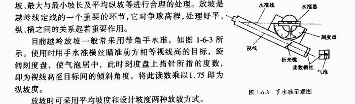 按平均坡度放坡:根據(jù)《公路工程技術(shù)標準》規(guī)定的平均坡度值5.0%—5.5%(按相對高差而定).視具體地形確定適當?shù)目v坡度,然后實地放坡。按平均坡度放坡只起到在一定長度范圍內(nèi)控制高差和水平距離的作用,優(yōu)點是放坡速度快,但沒有反映公路等級對平均縱坡的不同要求以及地形、地質(zhì)變化的情況。