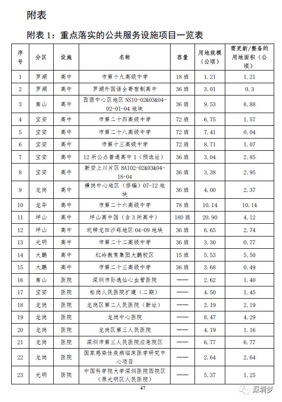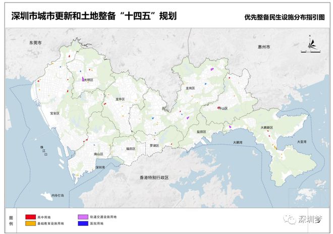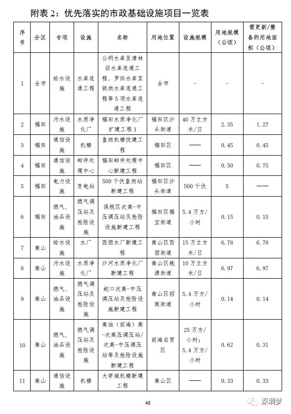3.規劃期內通過城市更新和土地整備完成基礎教育設施學位不少于21.3萬個,重點保障一批綜合醫院、高中等全市緊缺的大型公共服務設施用地供應,彌補民生短板。落實水質凈化廠、電力、環境生態園等市政設施用地,提升市政支撐水平。加快推動國鐵、城際鐵路、軌道及相關場站、新(擴)建主干路等用地整備,促進交通設施完善。