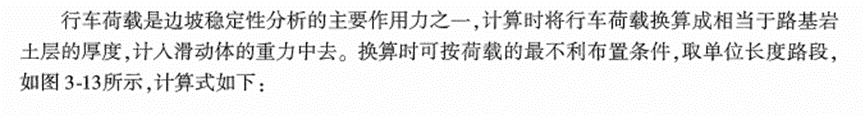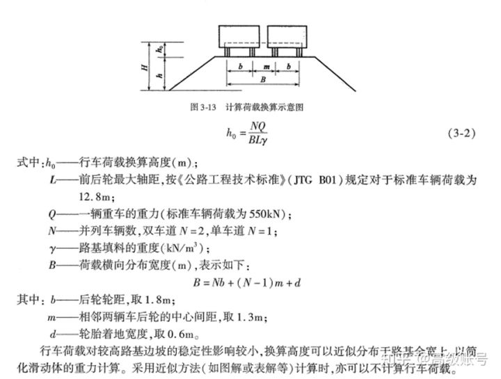 在《公路路基設(shè)計(jì)規(guī)范》(JTG D30-2015)中沒(méi)有發(fā)現(xiàn)對(duì)邊坡穩(wěn)定計(jì)算時(shí)行車荷載如何考慮的條文,但是在《路基路面工程》(黃曉明版)和《公路軟土地基路堤設(shè)計(jì)與施工技術(shù)細(xì)則》(JTG/T D31-02-2013)中有相關(guān)表述。《公路軟土地基路堤設(shè)計(jì)與施工技術(shù)細(xì)則》4.1.4-4.1.6條的規(guī)定如下,即將行車荷載換算成土柱高度,可按車輛荷載均布于車輛投影面積上換算得出。