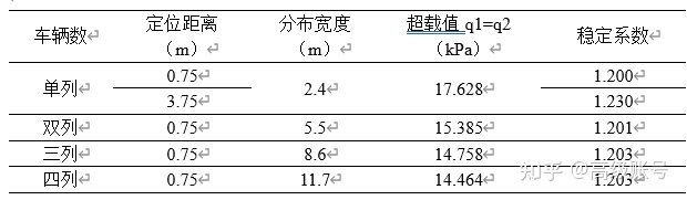 定位距離分成0.75m和3.75m兩類,假定土路肩寬度0.75m,硬路肩寬度3m,看車輛分布在硬路肩外邊緣和行車道外邊緣的區(qū)別。分布寬度和強(qiáng)度按照前述計(jì)算過(guò)程,從單列到四列,結(jié)果如下表。