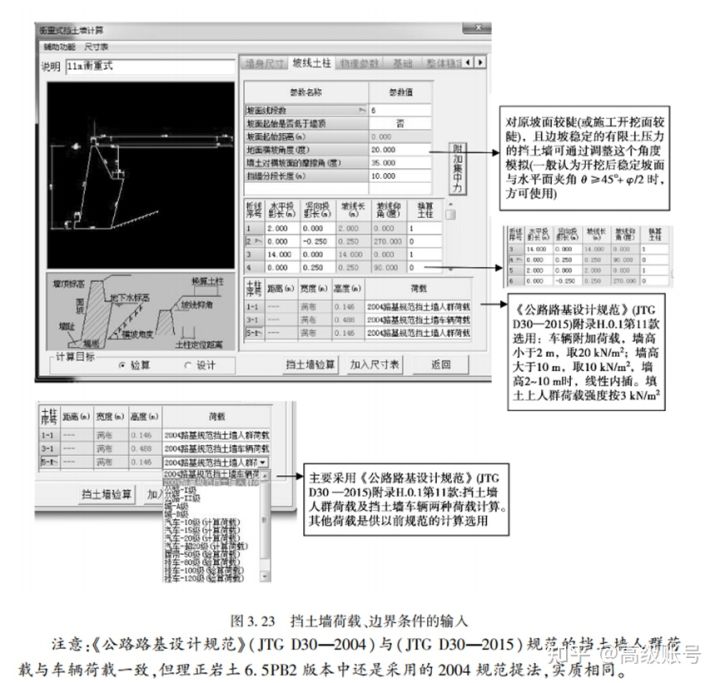 在實(shí)際設(shè)計(jì)工作中也常用理正軟件來(lái)進(jìn)行設(shè)計(jì)或驗(yàn)算。理正擋墻中內(nèi)置了多種計(jì)算車輛荷載的方法,其中采用“2004路基規(guī)范擋土墻車輛車載”這一選擇,即是跟現(xiàn)行規(guī)范的規(guī)定一致,換算土柱高度是根據(jù)我們輸入的墻高和填土容重自動(dòng)計(jì)算的。所以個(gè)人認(rèn)為直接選這一項(xiàng)就可以了。