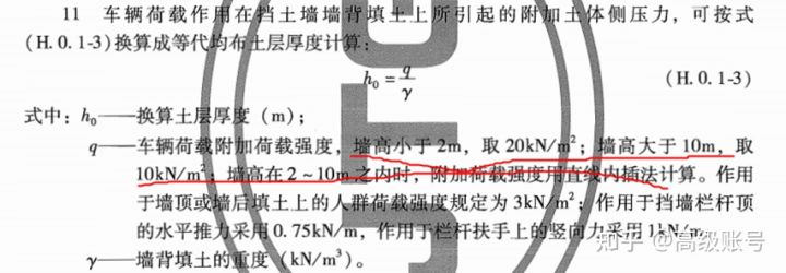 對(duì)于擋土墻的結(jié)構(gòu)設(shè)計(jì)和驗(yàn)算,在《公路路基設(shè)計(jì)規(guī)范》(JTG D30-2015)的附錄H里對(duì)行車荷載如何考慮是有規(guī)定的,H.0.1的11條,核心思路也是將車輛荷載換算為對(duì)應(yīng)土柱高度,但是相較穩(wěn)定計(jì)算則考慮的更為簡(jiǎn)單,它的車輛荷載附加荷載強(qiáng)度值是給定的,10~20kPa,按照規(guī)定取就行了。
