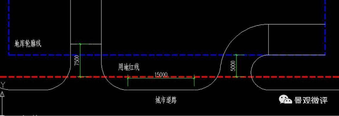 3)機動車停車庫的出入口的坡道終點面向城市道路時,其與城市道路紅線的距離不應(yīng)小于7.5m,平行城市道路或與城市道路斜交角度小于75度時應(yīng)后退基地的出入口不小于5.0m
