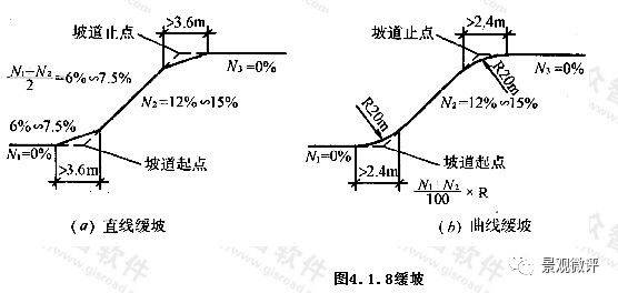 坡度超多10%時,坡道上下端應(yīng)設(shè)1/2坡度的緩坡 (直線緩坡 3.6米長,曲線緩坡 2.4米長)