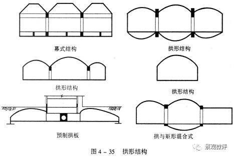 拱形結(jié)構(gòu)有單跨、多跨、幕式及拋物線拱、頂制拱板等多種類型