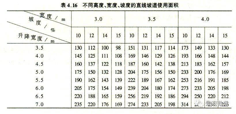 表4.14為坡道升降高度3.5~7.0 m,坡度為10%~15%條件下的直線坡道各段長度。表4.16為不同長度、寬度、坡度的直線坡道使用面積比較值。