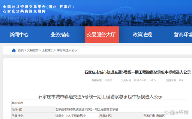 石家莊市城市軌道交通5號線一期工程勘察總承包中標(biāo)候選人公示