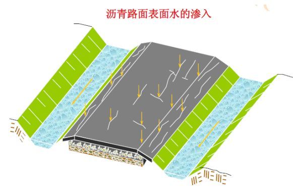 路面結構內部水的危害:浸濕各結構層材料和路基土,易造成無粘結粒狀材料和地基土的強度降低;使水泥混凝土路面產生唧泥,隨之出現錯臺、開裂和整個路肩破壞;進入空隙的自由水在行車荷載的作用下,會形成高孔隙水壓力和高流速的水流,引起路面基層的細顆粒產生唧泥,結果失去支承;在冰凍深度大于路面厚度的地方,高地下水位會造成凍脹,并在凍融期間降低承載能力;水使凍脹土產生不均勻凍脹;與水經常接觸將使瀝青混合料剝落,影響瀝青混凝土耐久性和產生龜裂。