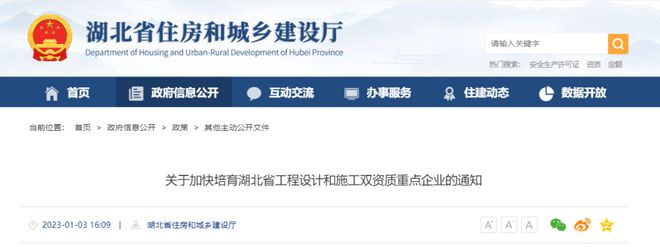 1月3日,湖北省住建廳發(fā)布《關(guān)于加快培育湖北省工程設(shè)計(jì)和施工雙資質(zhì)重點(diǎn)企業(yè)的通知》。