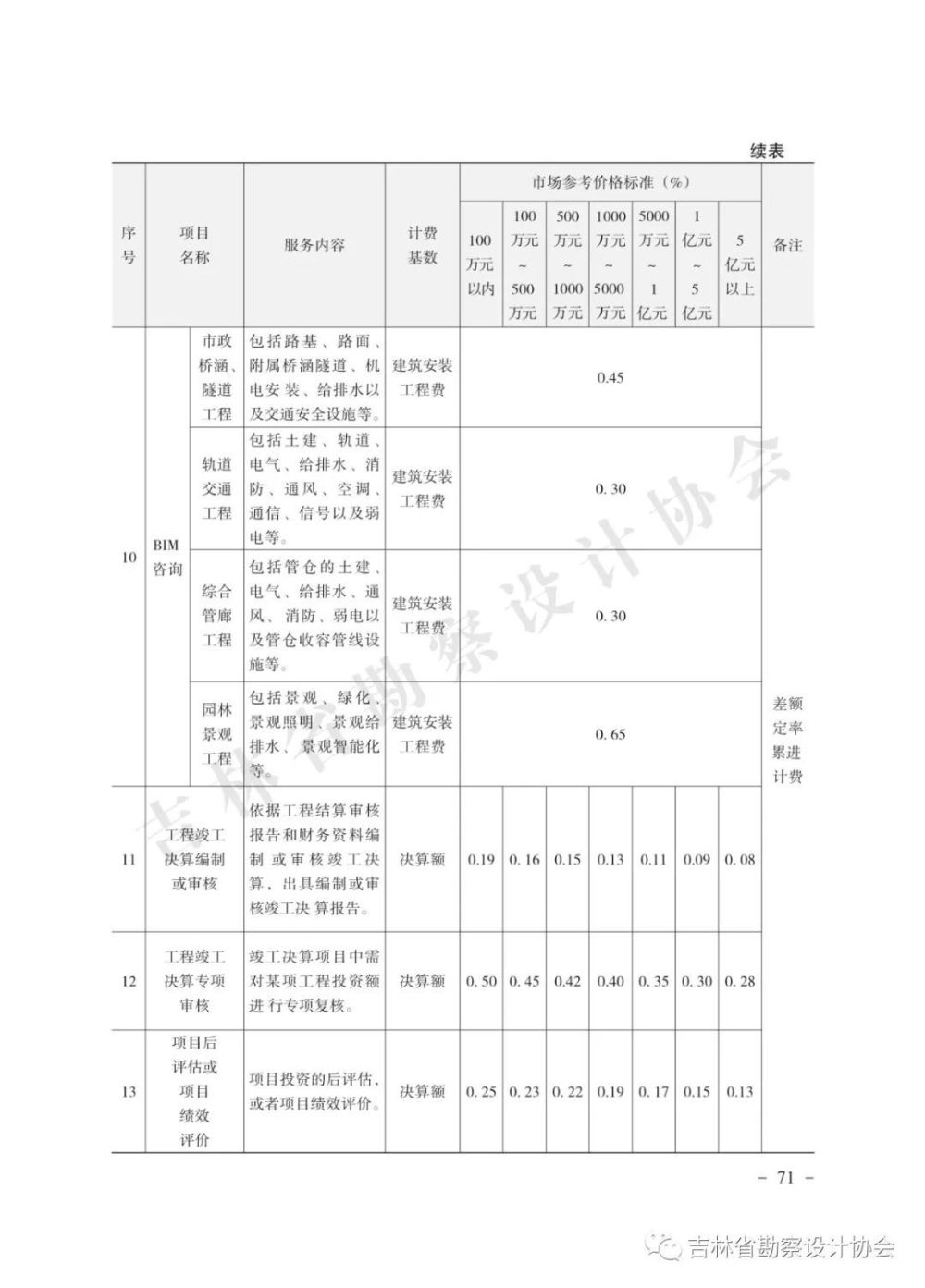 吉林省勘察設(shè)計(jì)協(xié)會(huì)通過對(duì)各地市勘察設(shè)計(jì)服務(wù)成本要素信息進(jìn)行統(tǒng)計(jì)、分析及研究,在組織會(huì)員單位充分研討的基礎(chǔ)上,結(jié)合該省市級(jí)情況,對(duì)《吉林省建筑工程勘察設(shè)計(jì)收費(fèi)指導(dǎo)價(jià)(試行)》予以修編,形成了《吉林省工程勘察設(shè)計(jì)收費(fèi)導(dǎo)則》。