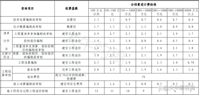 5、建設工程造價咨詢服務收費標準實行分檔累進計費方式。