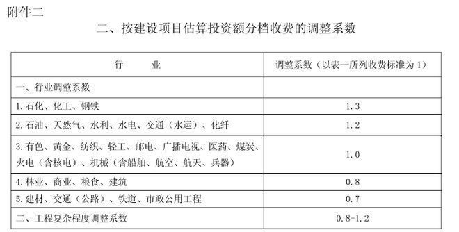 工程復雜程度調整系數:0.8~1.2(工程復雜程度具體調整系數由工程咨詢機構與委托單位根據各類工程情況協商確定)。