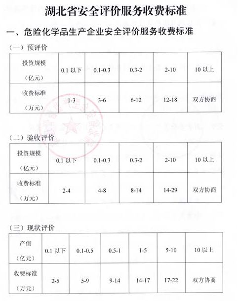 安全評價可參考地方收費標準,如湖北省地方收費標準——《省物價局 省安全生產監督管理局關于安全評價服務收費有關問題的通知》(鄂價工服〔2016〕56號),具體如下: