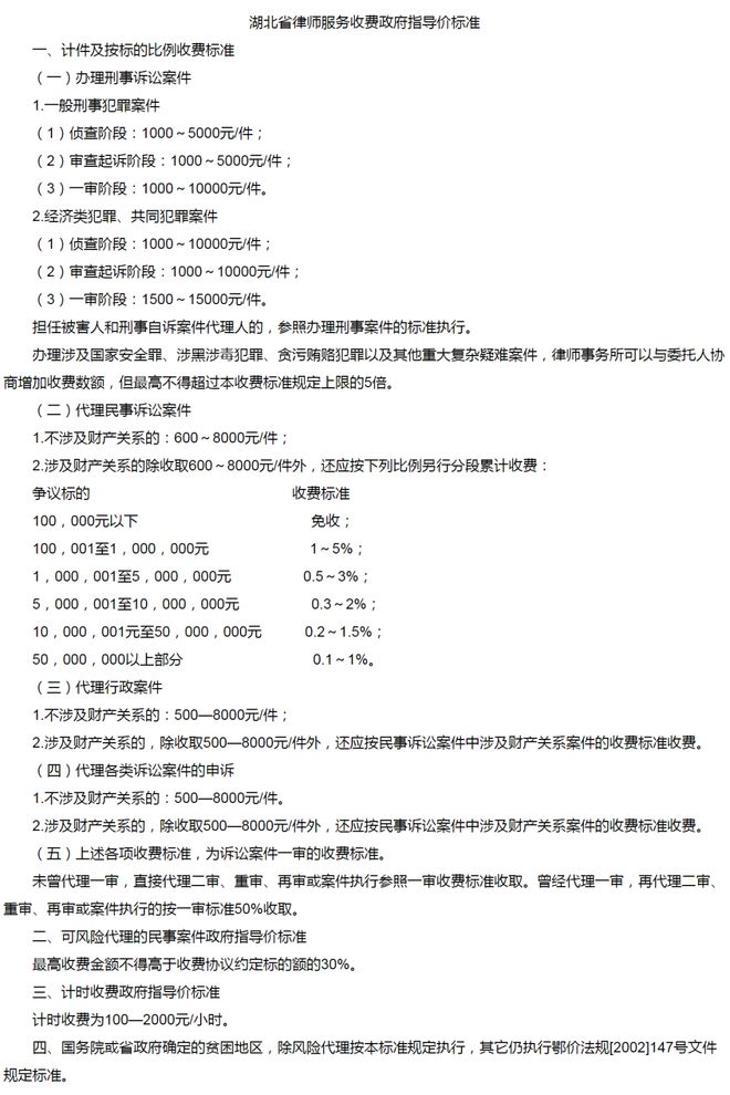 法律咨詢服務取費可參考地方收費標準,如湖北省地方標準——《湖北省物價局、湖北省司法廳關于印發<湖北省律師服務收費管理實施辦法(暫行)>的通知》(鄂價房服〔2006〕258號),具體如下: