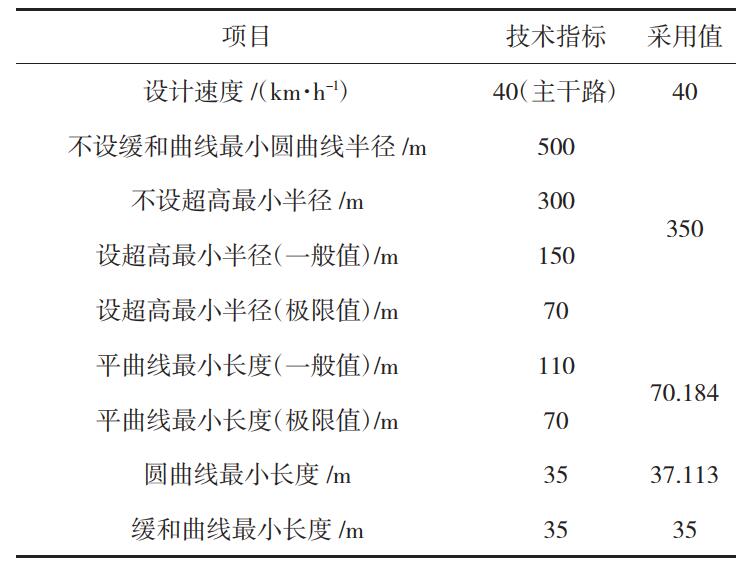 平面設計綜合考慮與老路平面順接、道路等級要 求、橋梁位置要求。設計范 圍 為 K0-055 ~K0+447,路線全長 502 m,其中橋梁段長度約 60 m,位于直線段上,道路段長度約 442 m。平面線形標準及設計采用值見表 1[2]。