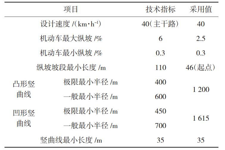 縱斷面設計綜合考慮與老路順接、新建橋梁梁頂標高、路面處理方案、平縱線形組合等因素。設計范圍內共設計豎曲線三處,包括兩條凹形豎曲線、一條凸形豎曲線。最大縱坡 2.5%,最小縱坡0.3%,最大坡長 193.528 m,最小坡長為起始段順接老路坡長 46 m,凸形豎曲線半徑 1 200 m,凹形豎曲線最小半徑 1 615 m。其中新建橋梁位于 2.5%的上坡及 -2.4%的下坡段上,豎曲線半徑為 1 200 m。主要技術指標見表 2。