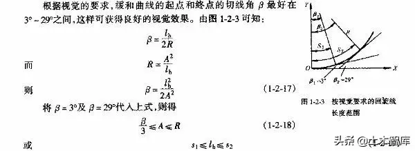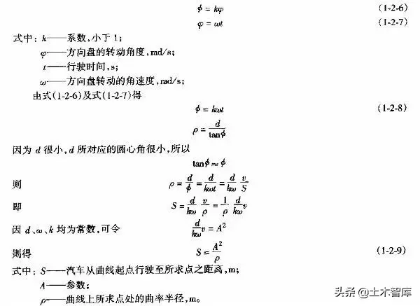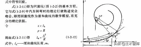 上式表明.最短的緩和曲線與半徑的大小無關,即使平曲線半徑較大,當汽車高速行駛時,也應有個轉變過程,因而式(1-2-15)是高等級公路設置緩和曲線的校核式。