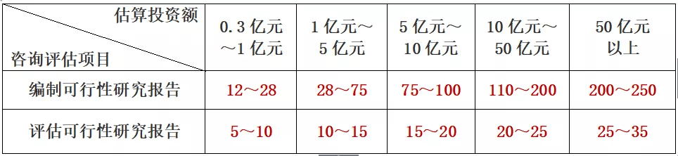 方法1:按建設項目估算投資額,分檔計算可行性研究報告編制和評估的咨詢服務費用(詳見表1),并由工程咨詢機構和委托單位根據(jù)各類項目復雜程度協(xié)商確定具體調整系數(shù)(詳見表2)