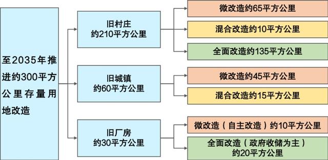 《專項規劃》統籌新增用地與存量用地資源配置,規劃至2025年,累計推進城市更新約130平方公里(含城中村改造70平方公里);至2030年,累計推進城市更新約230平方公里(含城中村改造120平方公里);至2035年累計推進城市更新約300平方公里(含城中村改造155平方公里),通過微改造、混合改造、全面改造多種方式并舉,推動低效存量土地的盤活再利用。