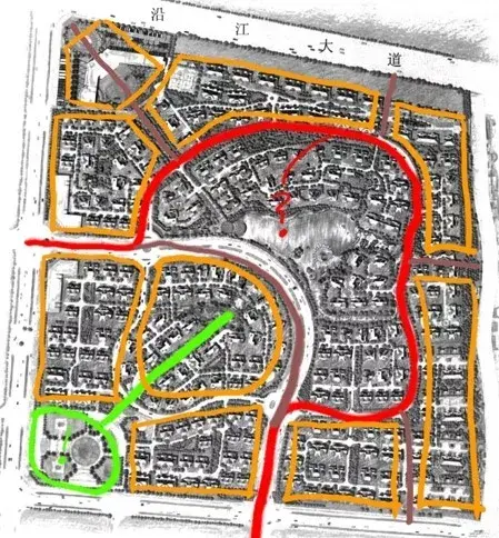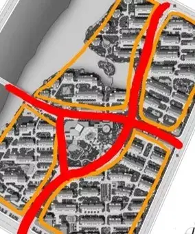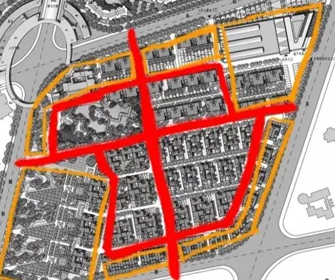 用地中間做環形道路,向外引出錯落的分支道路,形成各自獨立的組團,中心適宜做景觀。