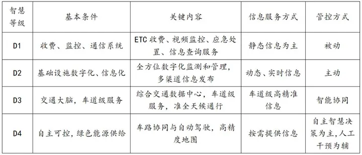 甘肅省交通運輸廳2022年3月印發的《甘肅省智慧高速公路建設技術指南》,提出了智慧高速公路建設應從路段級、區域路網級、全域路網級三個層面進行實施,將智慧高速公路的智慧化等級由低到高分為 D1、D2、D3、D4 四個等級。