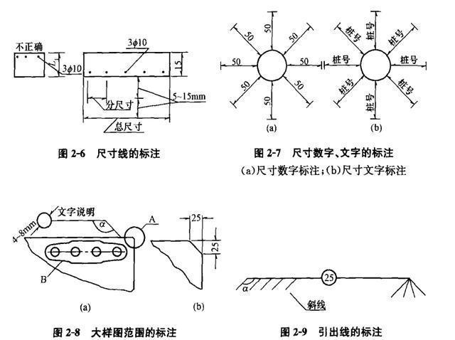 (6)當(dāng)用大樣圖表示較小且復(fù)雜的圖形時(shí),其放大范圍應(yīng)在原圖中采用細(xì)實(shí)線繪制圓形或以較規(guī)則的圖形圈出,并用引出線標(biāo)注(圖2-8)。