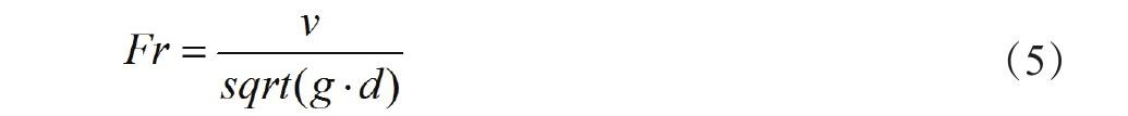 (2)確定管道尺寸。根據(jù)最大流量和施工要求,確定排水管道的直徑或斷面形狀[8]。在確定管道尺寸時,需要考慮管道自清潔速度、懸沙能力和維護性等因素。管道的自清潔速度是指在正常流量下,管道內(nèi)部能夠?qū)⒎e聚的污物、雜物和沙粒沖刷走的速度,采用Froude數(shù)可判定管道自清潔度,其計算公式見式(5)。